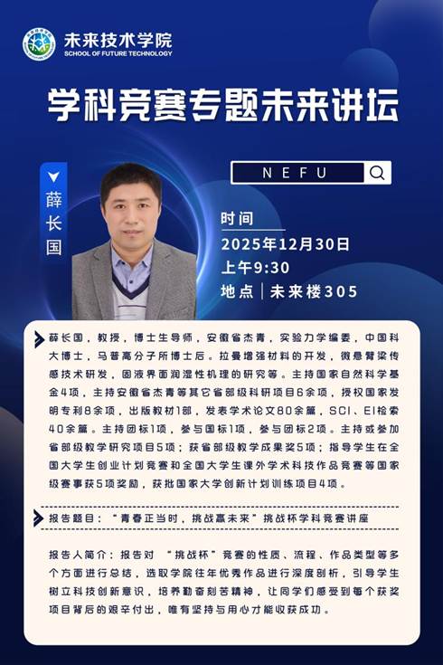 报告题目:报告人:“青春正当时,挑战赢未来”挑战杯学科竞赛讲座时间:2025年12月30日上午9点30分地点:未来楼305报告厅欢迎各位教师、同学积极参加
