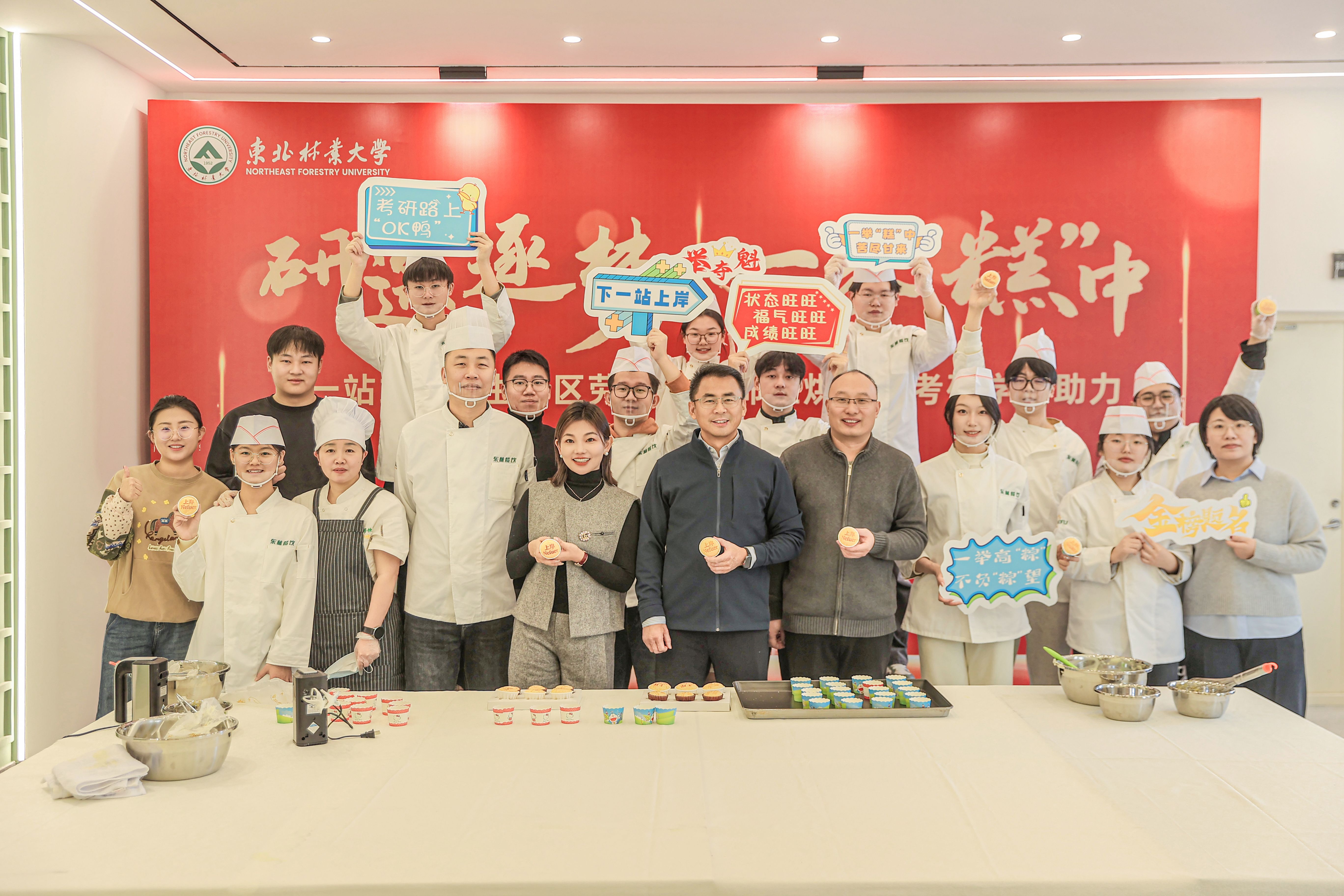 张春雷在体验过程中鼓励同学们积极参与劳动体验,从不同类型的劳动中锤炼品格,收获成长,并与考研学生一同将大家制作的杯子蛋糕送入烤箱。