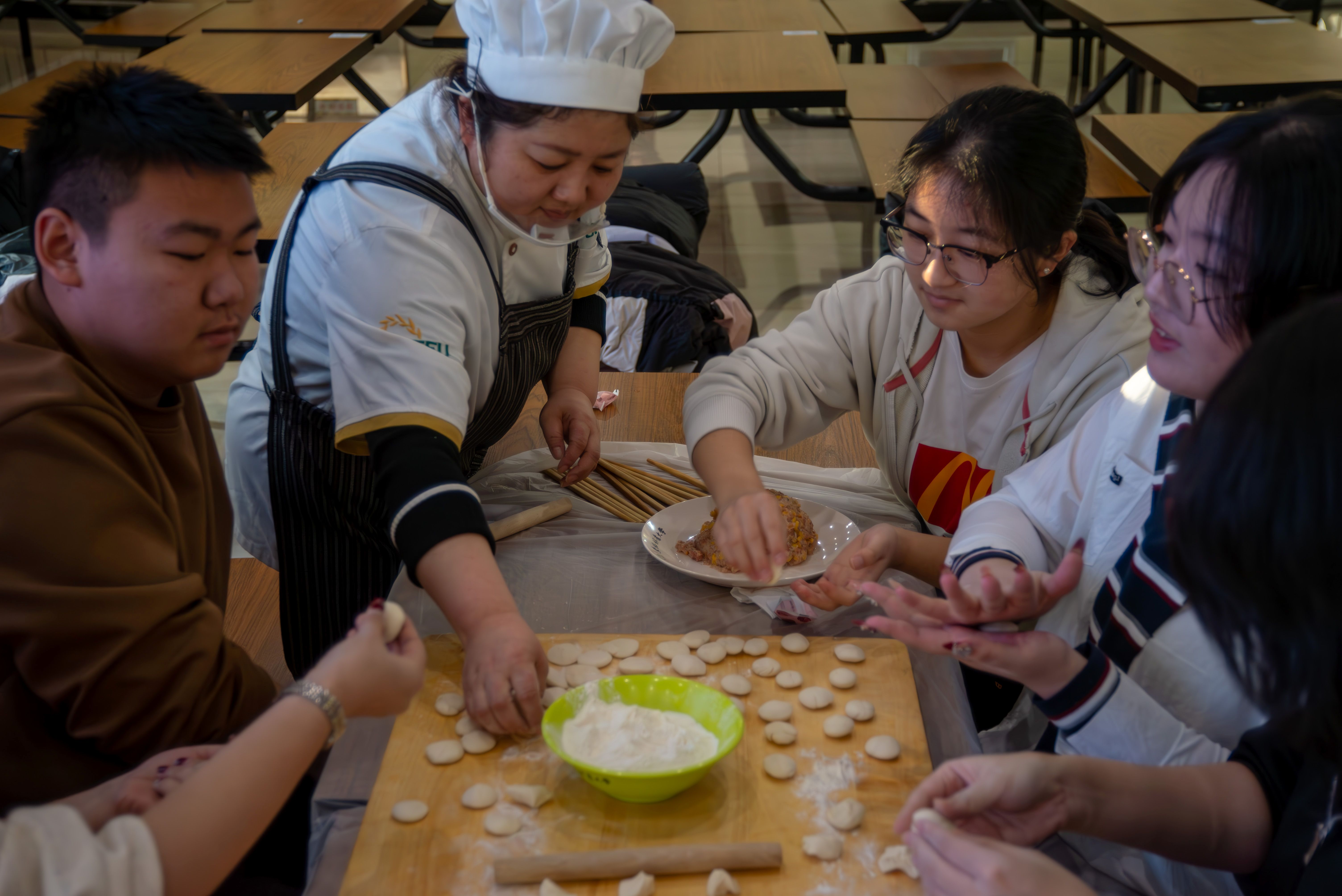 劳动课堂请饮食中心饺子园专业工作人员担任劳动导师,为大家提供全程指导。老师从面团处理、擀皮手法到馅料搭配、捏合技巧,进行了细致入微地讲解与演示。“元宝形寓意吉祥如意,月牙形讲究皮薄馅足”,导师一边操作一边分享包饺子的小窍门,同学们认真观摩、积极提问,现场学习氛围浓厚。