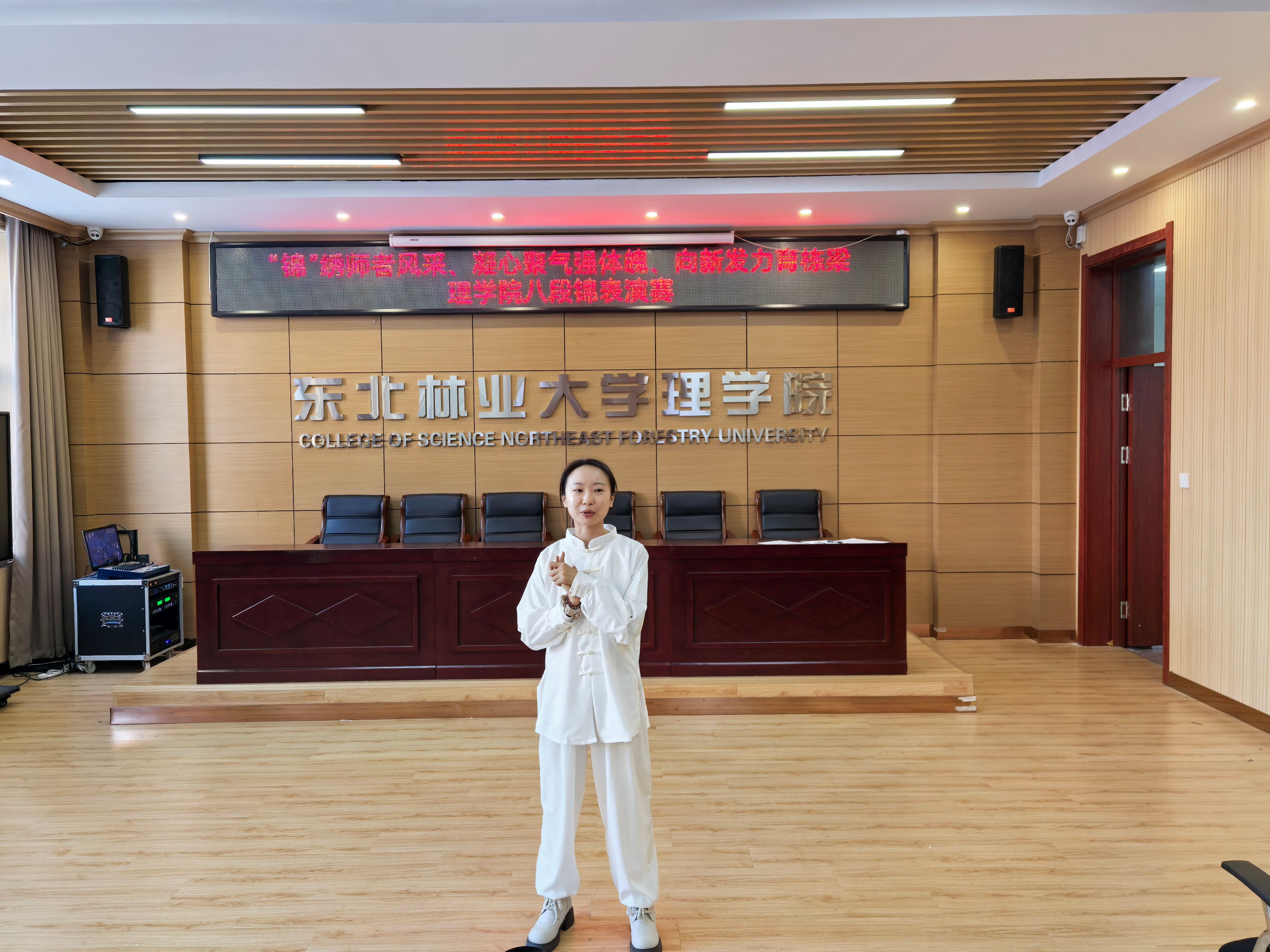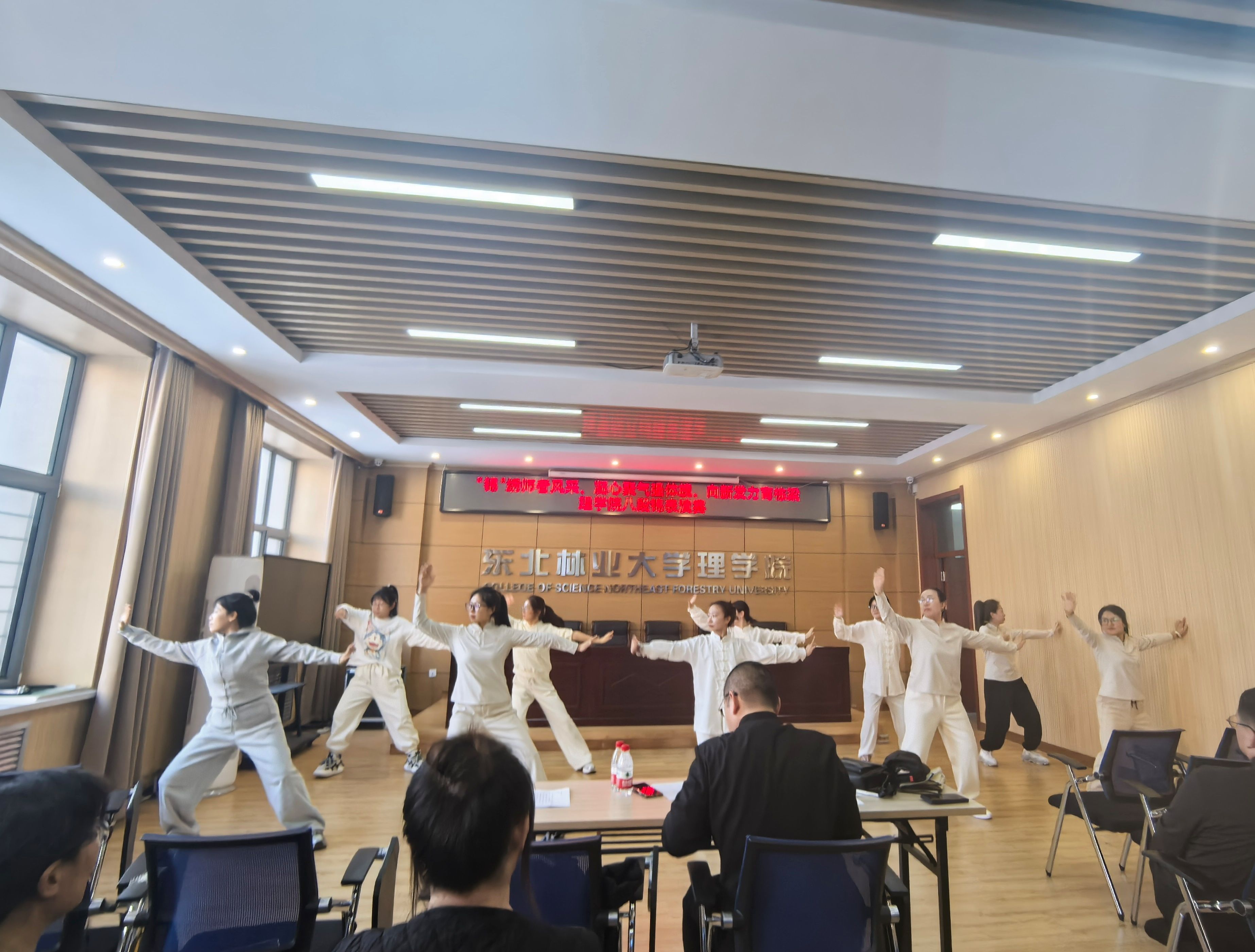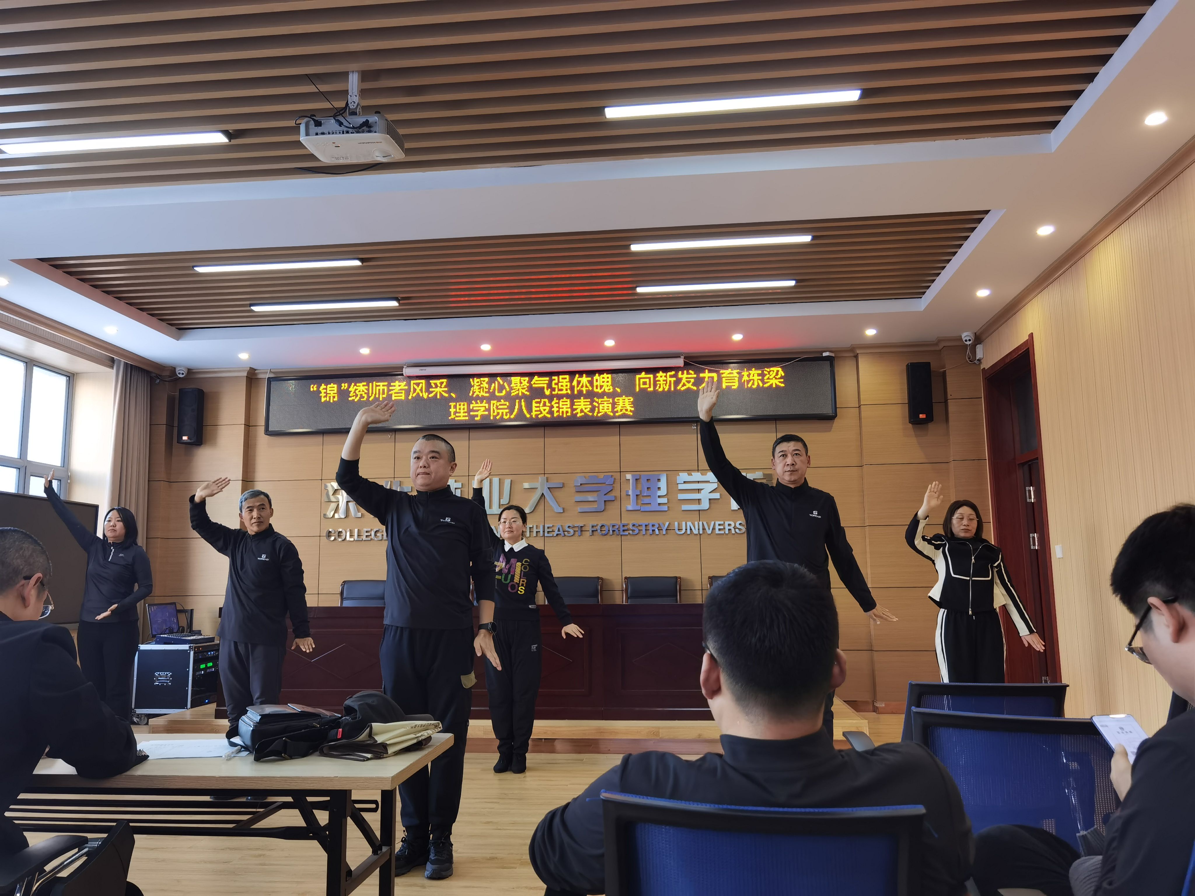 比赛现。鞔矶幼孕凶橹骋蛔抛,精神饱满,气宇轩昂。伴随着悠扬婉转的韵律,参赛老师们动作舒展大方,刚柔并济,将八段锦柔和连贯、圆活虚实的特点展现得淋漓尽致。一招一式中,不仅展现了理学院教师昂扬向上的精神风貌,更体现了中华传统健身气功的独特韵律之美。
