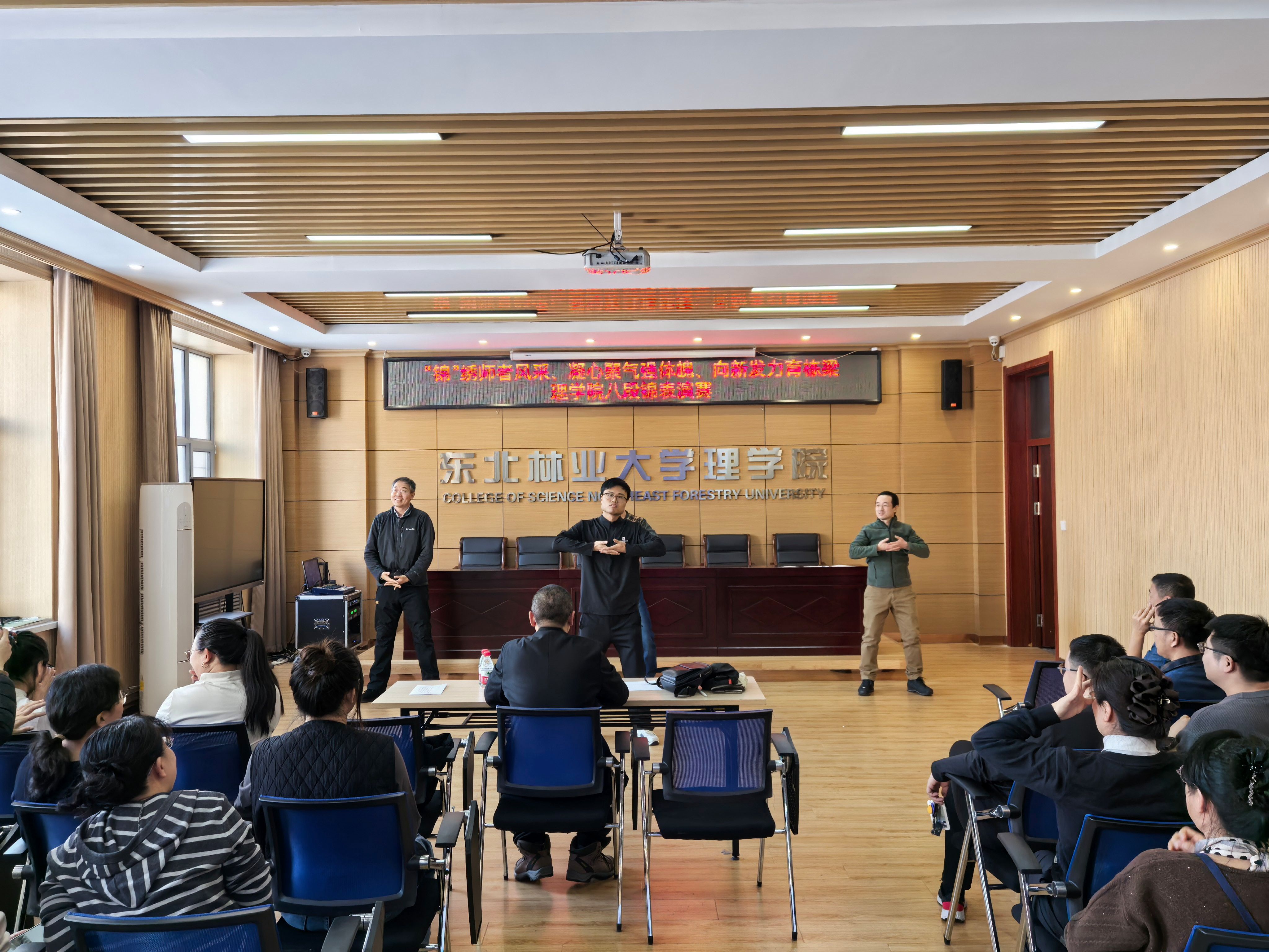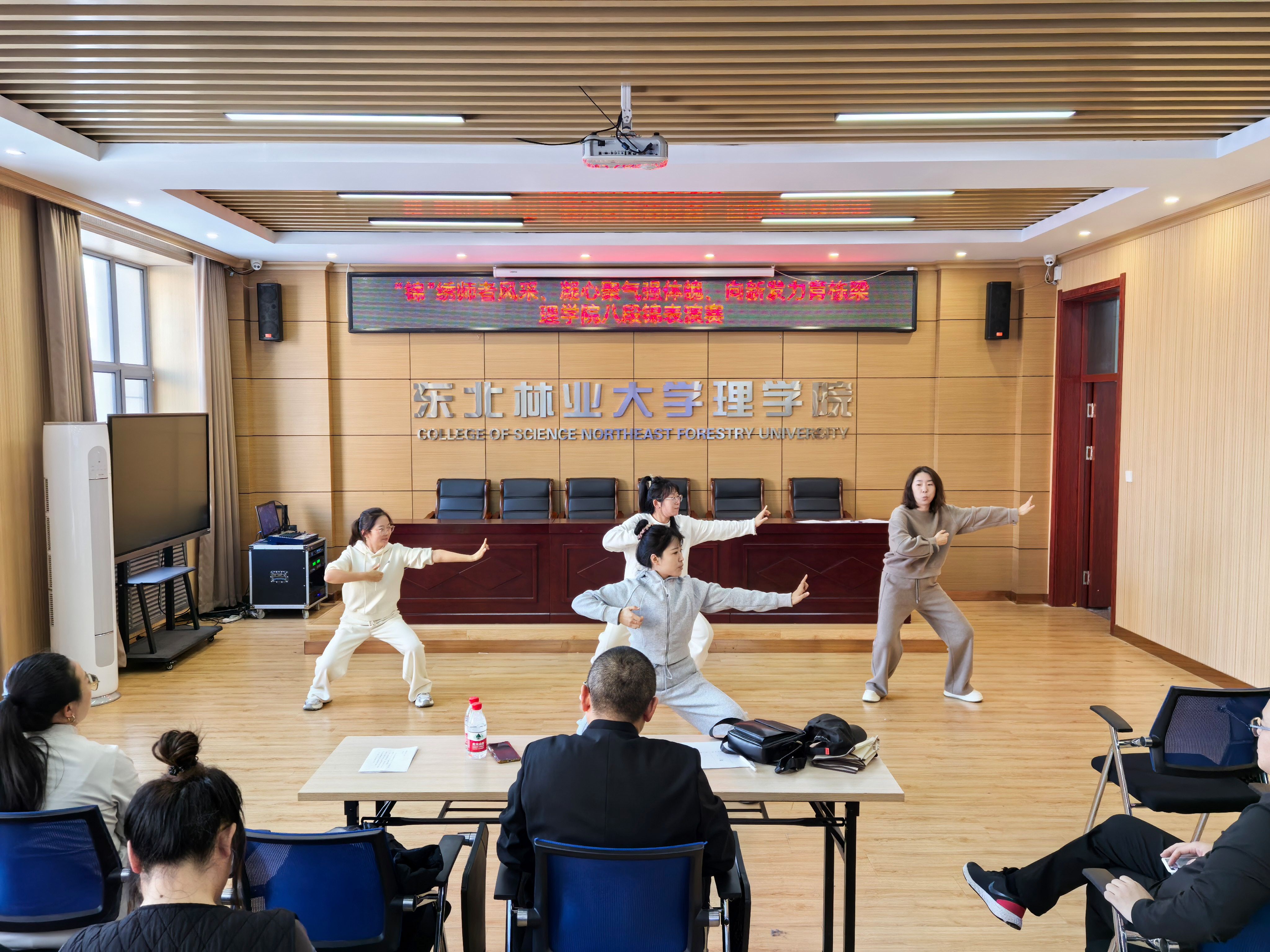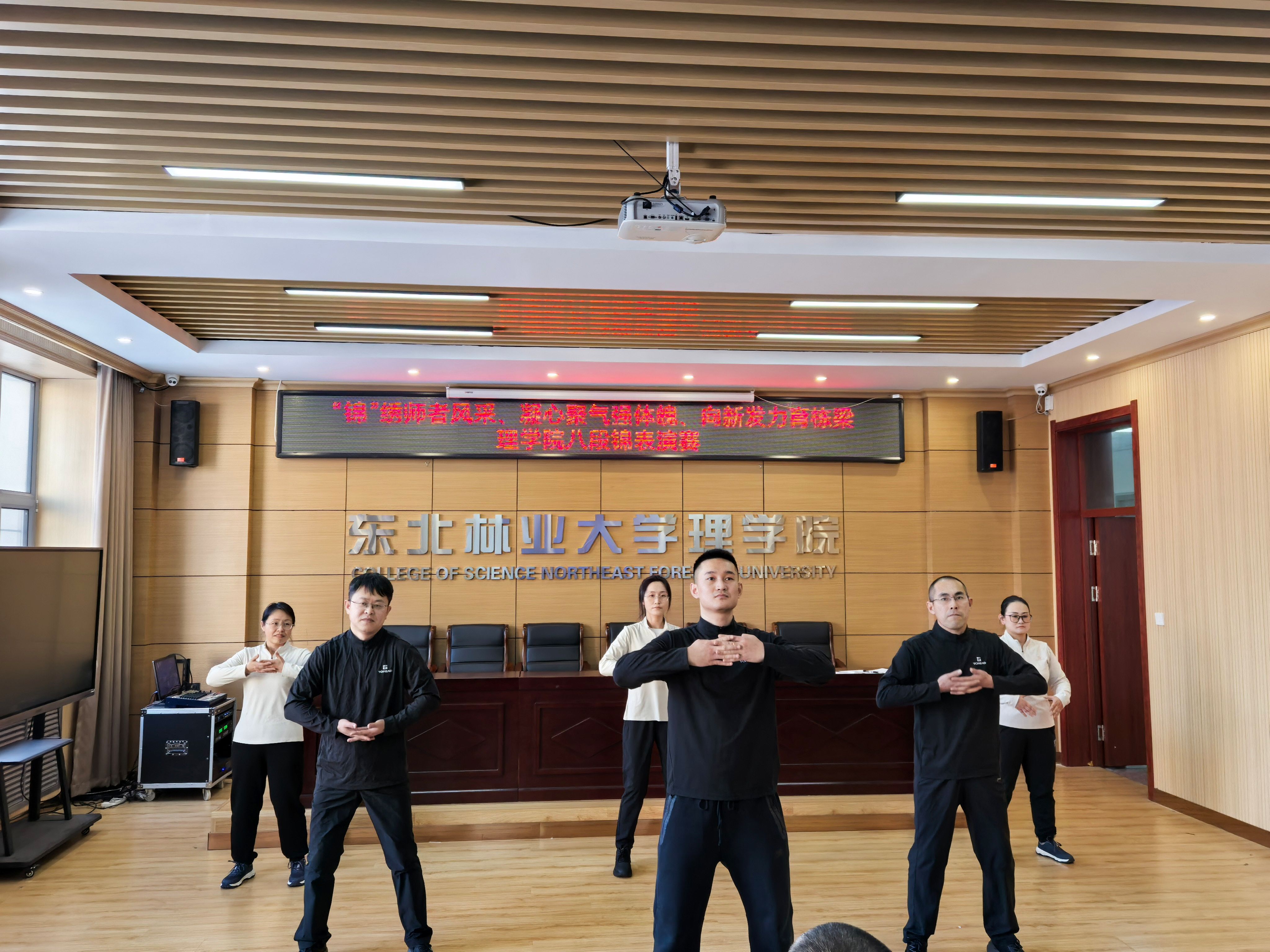 为弘扬中华优秀传统文化,倡导健康生活理念,提升教职工身体素质与团队凝聚力,12月24日下午,理学院工会在锦绣楼举办了以“锦绣师者风采、凝心聚气强体魄、向新发力育栋梁”为主题的教职工八段锦表演赛。体育部教师张晓龙担任评委。