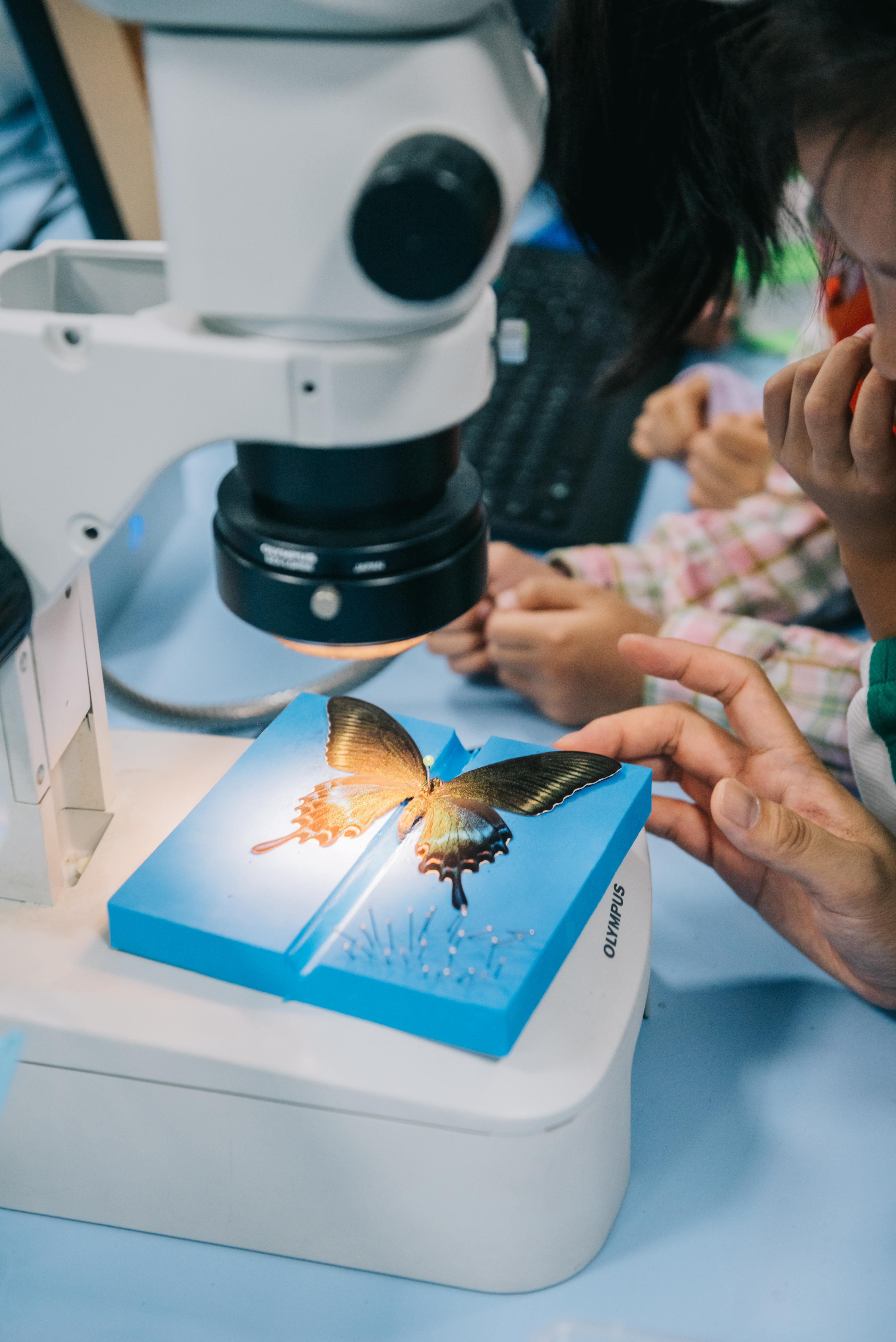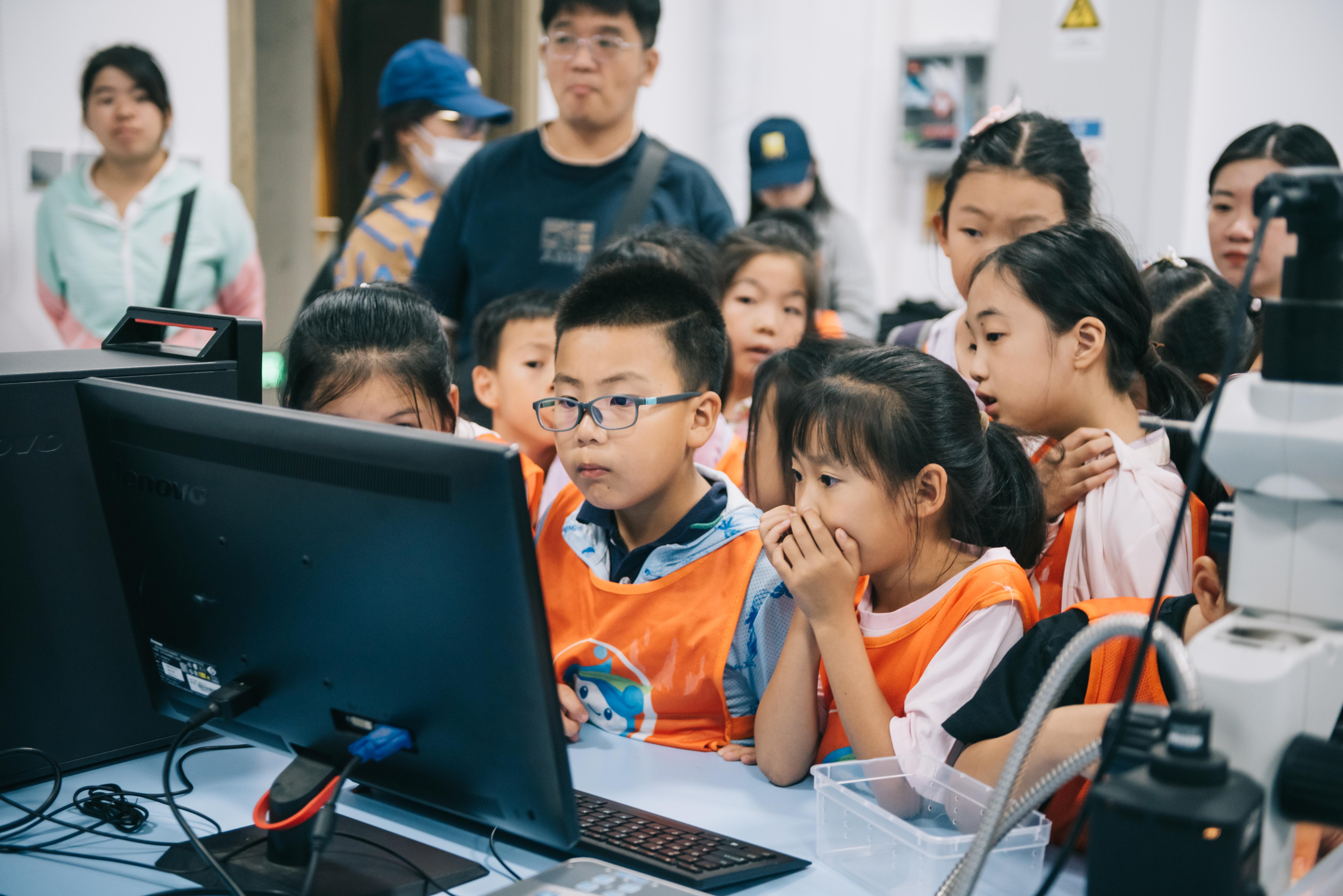 在显微成像室,孩子们借助显微镜观察树木茎结构的组成、蝴蝶锹甲等昆虫的身体结构。小朋友们在老师的指导下试着动手调节显微镜观察动植物标本。通过显微成像技术的展示与互动,孩子们看到了动植物的微观世界。来自哈尔滨工业大学附属中学(小学部)的孟瑾丞感慨到:“我通过显微镜,才知道为什么蝴蝶的颜色是五彩斑斓的,因为它翅膀表面被有许多细小的鳞片,鳞片闪着晶莹的光,而鳞片结构不同,呈现的颜色就不同,真是太神奇了!”