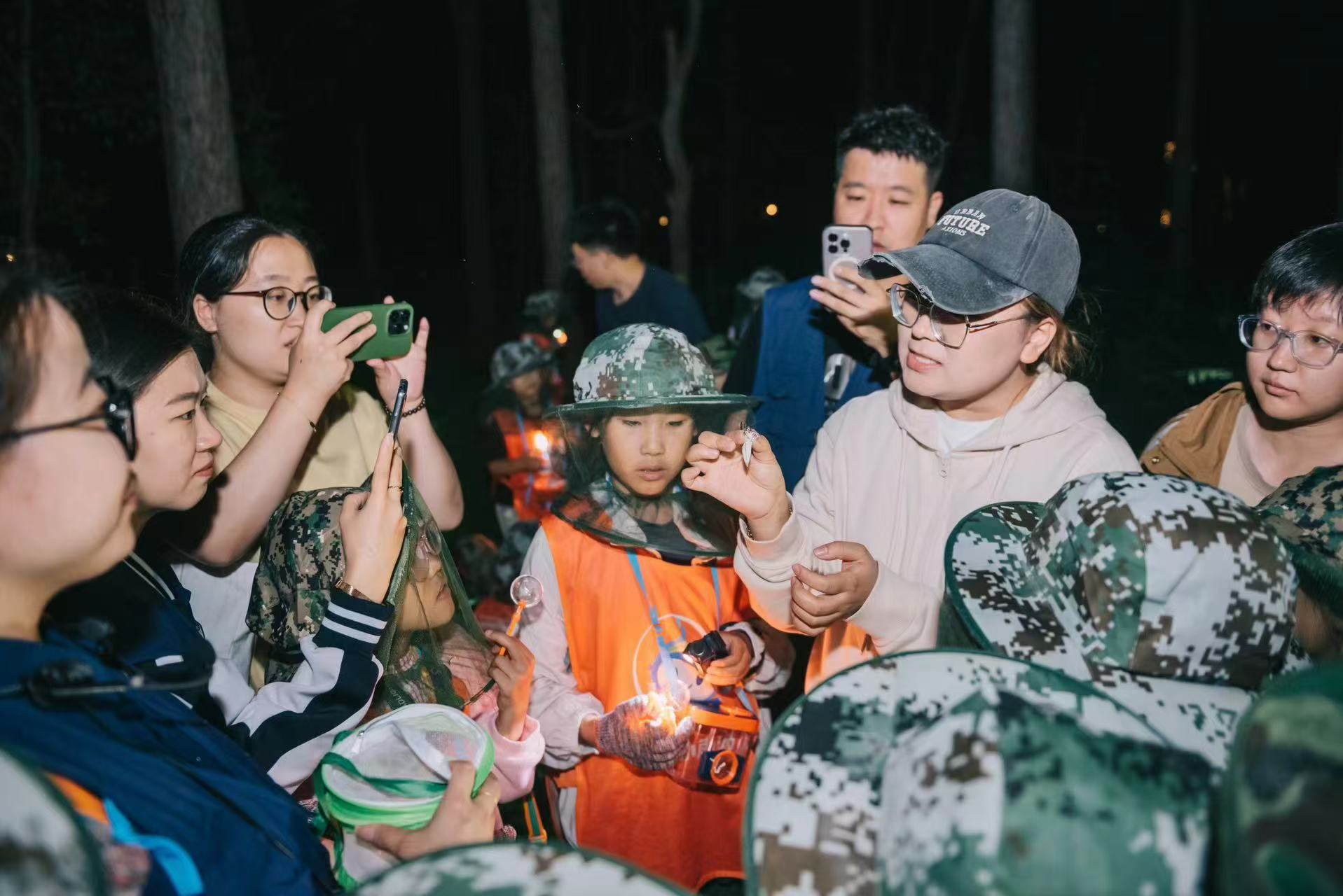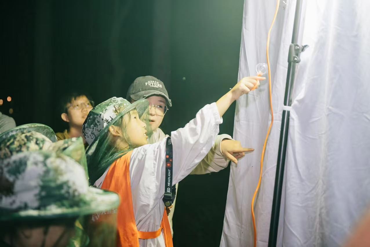 夜幕降临了,昆虫灯诱活动在金元元博士带领下进行。小朋友们全副武装,防虫帽、手套、头灯、昆虫盒装备齐全,昆虫在灯诱设备的吸引下聚拢过来,金博士和小雨滴科学实验室张梅丽老师带小朋友们观察了夜蛾、螽斯、叶甲、蝎蛉等10余种常见的昆虫。通过森林夜探,孩子们不仅亲眼见证了昆虫世界的多样性与奇妙,还深刻体会到了科技发展在生态保护中的重要作用。